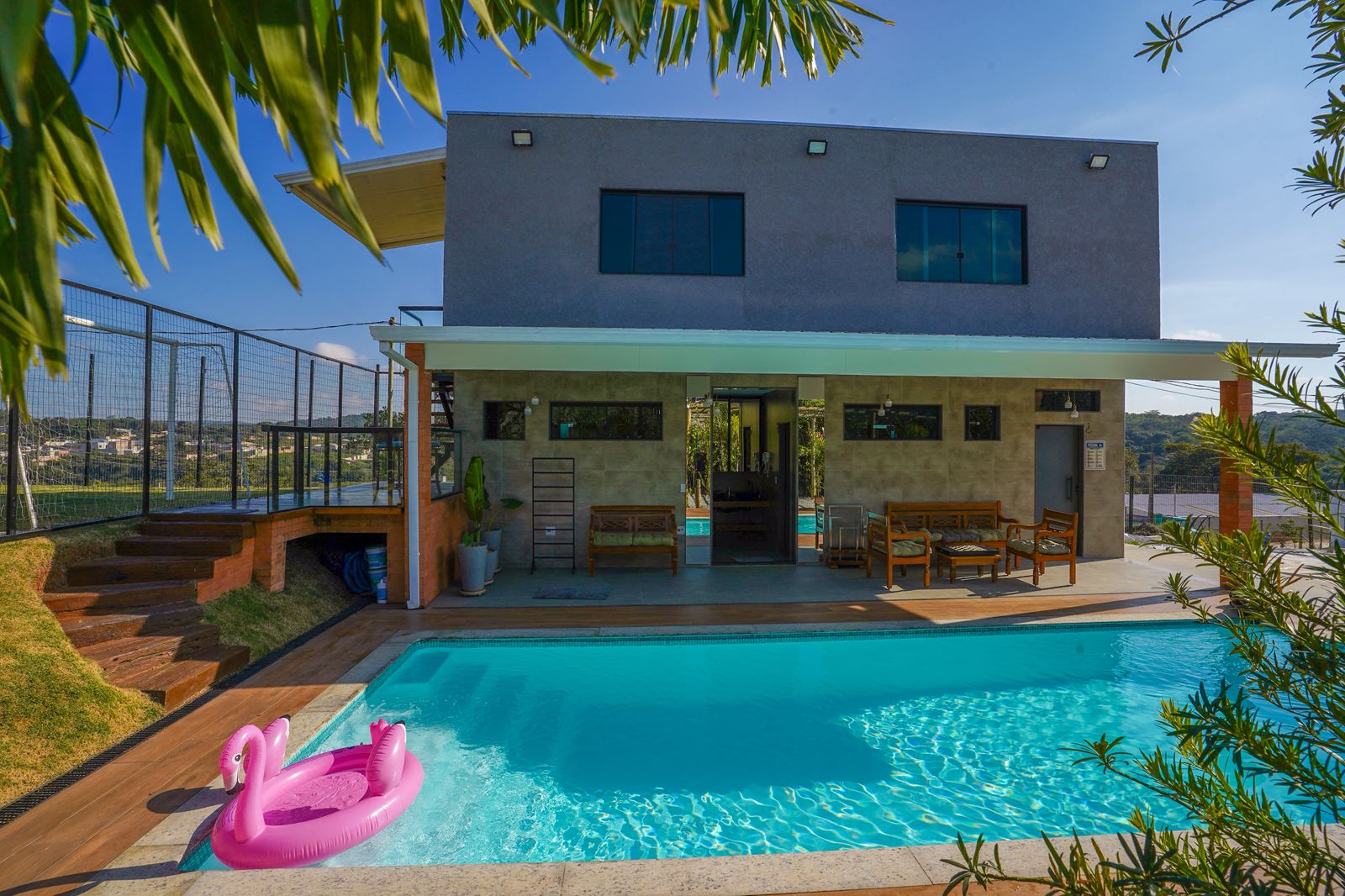 01 suíte com 01 cama de casal, 01 sofá cama, 01 cama de solteiro, ar-condicionado, frigobar, micro-ondas e projetor.
